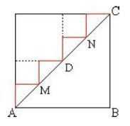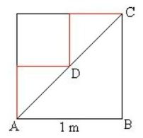 Ahora, en el primer paso, formamos una línea quebrada, de A a C, pasando por D. Está claro que esta línea (roja) mide 2, y la diagonal AC mide \sqrt{2}En el segundo paso, repetimos el proceso, pero ahora con las mitades de AD y de DC. La línea roja sigue midiendo 2, ya que cada «trocito», mide 0,25: