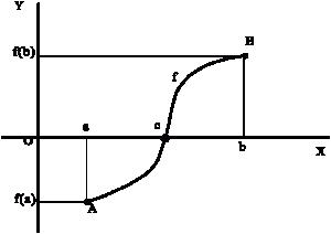 Es decir, si tenemos un punto en el que la función toma un valor negativo, y otro punto en el que la función toma un valor positivo, más adelante, entonces entre medio tiene que haber algún punto en el que la función valga 0. Gráficamente, sería algo así: