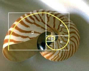 Y todas las medidas que son proporcionales con esta razón, \Phi, se conocen como proporción áurea o divina proporción. Y esto es lo que se manifiesta en la reproducción de los conejos también aparece en otros aspectos de la naturaleza. Por ejemplo, en las espirales de un caracol nautilus cumplen que en cada parte las proporciones siguen las mismas que dos números de Fibonacci consecutivos:
