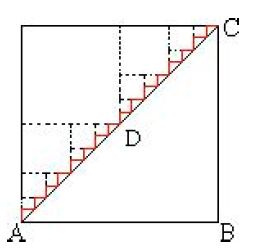 Decíamos que la diagonal medía , de acuerdo con el teorema de Pitágoras. Y si recorríamos los lados del cuadrado era 2, lógicamente. Haciendo líneas quebradas, veíamos que sumaban 2 de longitud (porque era lo mismo que recorrer dos lados del cuadrado.